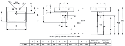 Connect CUBE Умывальник 50 см, 1 отверстие под смеситель. Для установки с колонной/полуколонно
