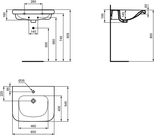 CONTOUR 21 раковина 65 см для инвалидов, 1 отверстие под смеситель, без перелива