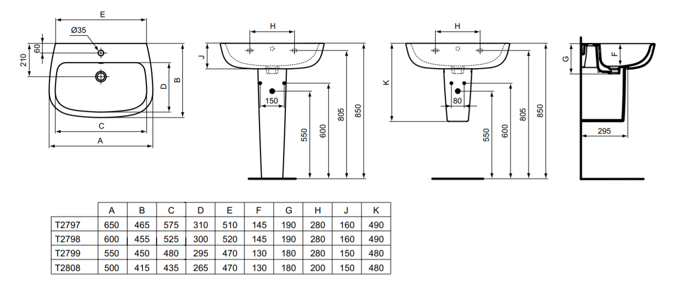 С отверстием перелива, без крепежа, для монтажа с колонной, полуколонной или дизайн-сифоном