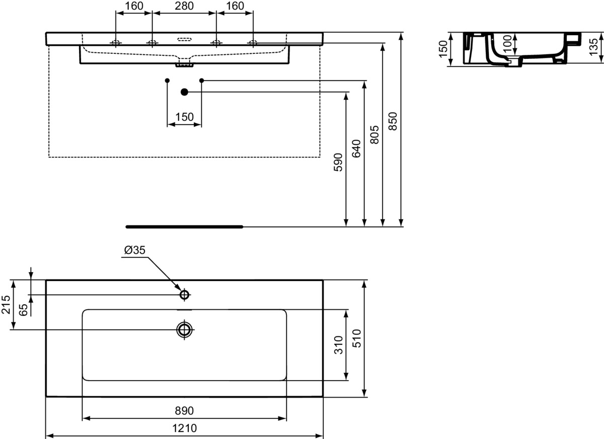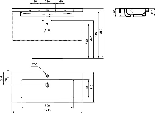 Extra 121х51х15см, подвесная раковина, санфарфор, с отв. под смеситель, арт. T437001, Ideal Standard