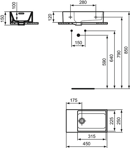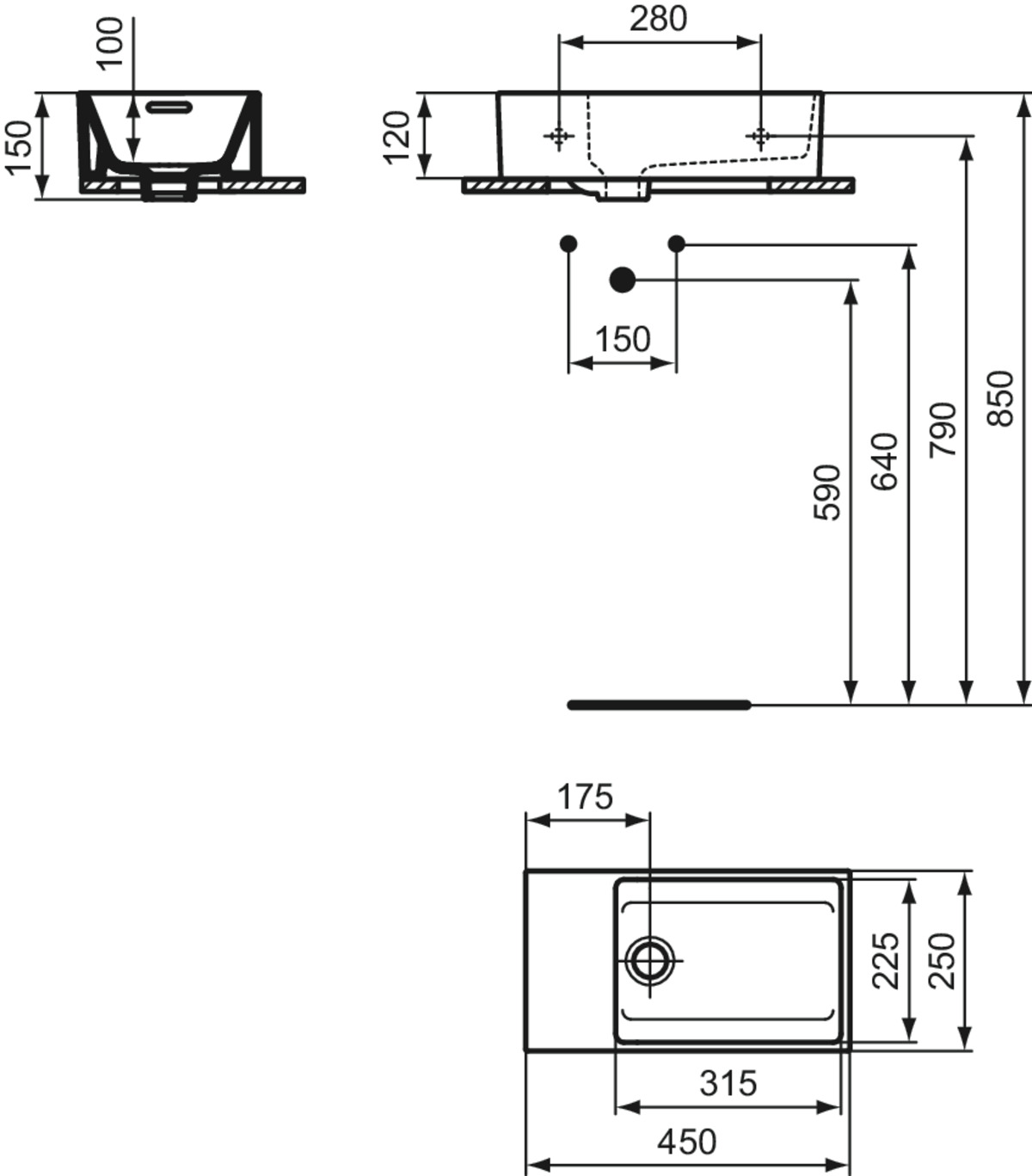 Подвесная раковина Extra 45х25х12 см, левая, нижняя поверхность отшлифована, санфарфор
