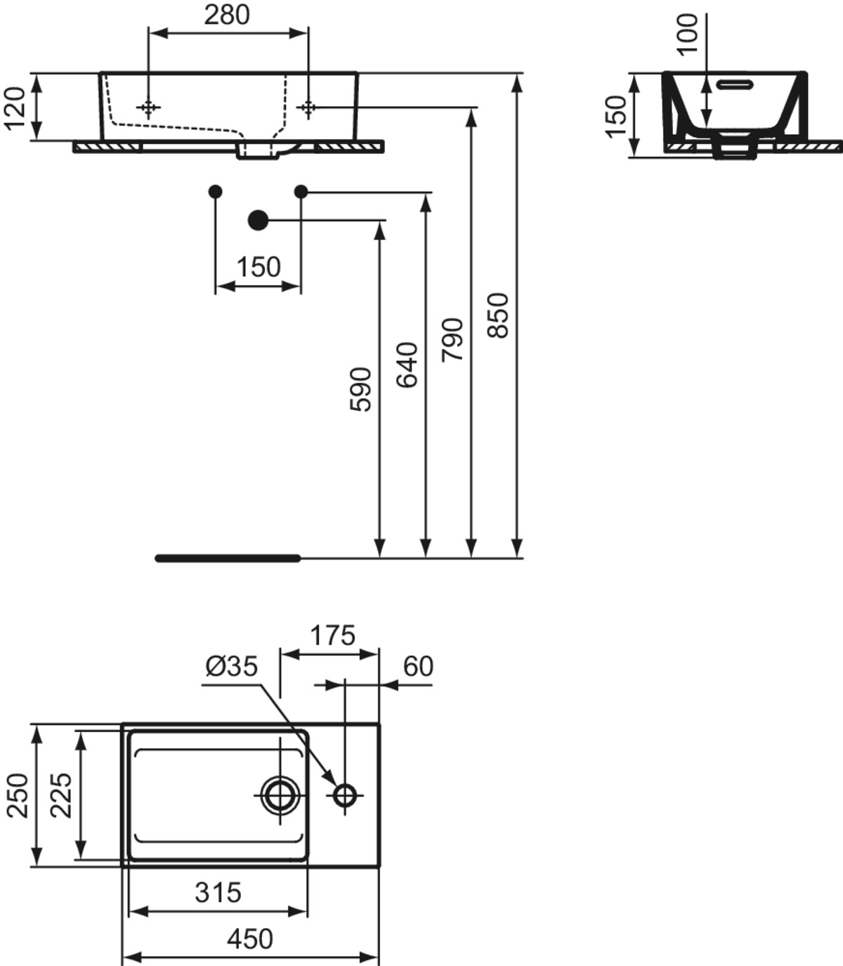 EXTRA Раковина для рук 45х25 см с отверстием под смеситель справа, с отверстием перелива, с крепежом TT0299729