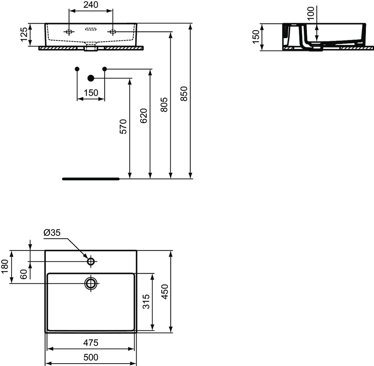 EXTRA Раковина 50 см с отверстием под смеситель, с отверстием перелива, нижняя поверхность отшлифована