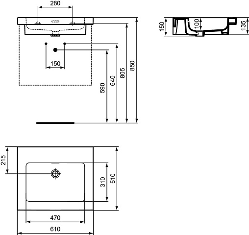 EXTRA VANITY Раковина 61 см, без отверстий под смеситель, с отверстием перелива