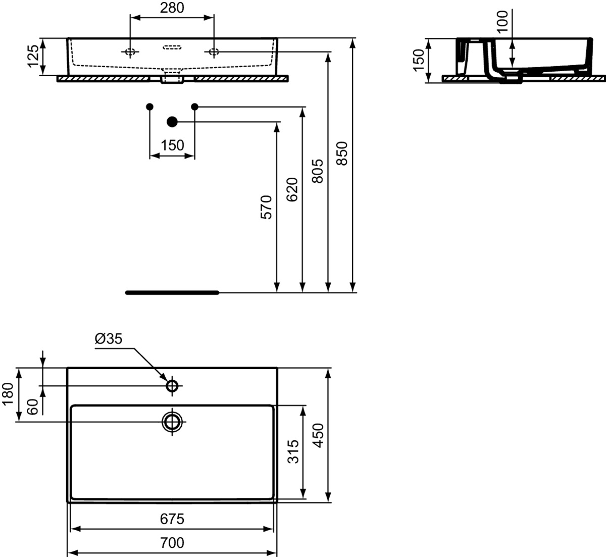 Подвесная раковина Extra 70х45х15 см, нижняя поверхность отшлифована, санфарфор, с отв. под смеситель