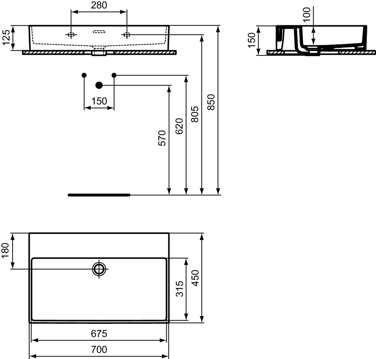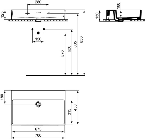 EXTRA Раковина 70 см без отверстия под смеситель, с отверстием перелива, нижняя поверхность отшлифована