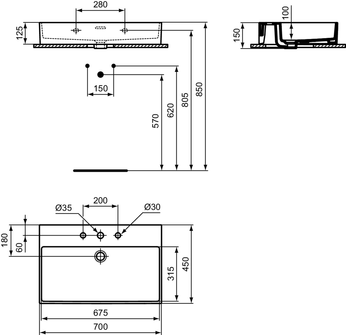 EXTRA Раковина 70 см с тремя отверстиями под смеситель, с отверстием перелива, нижняя поверхность отшлифована