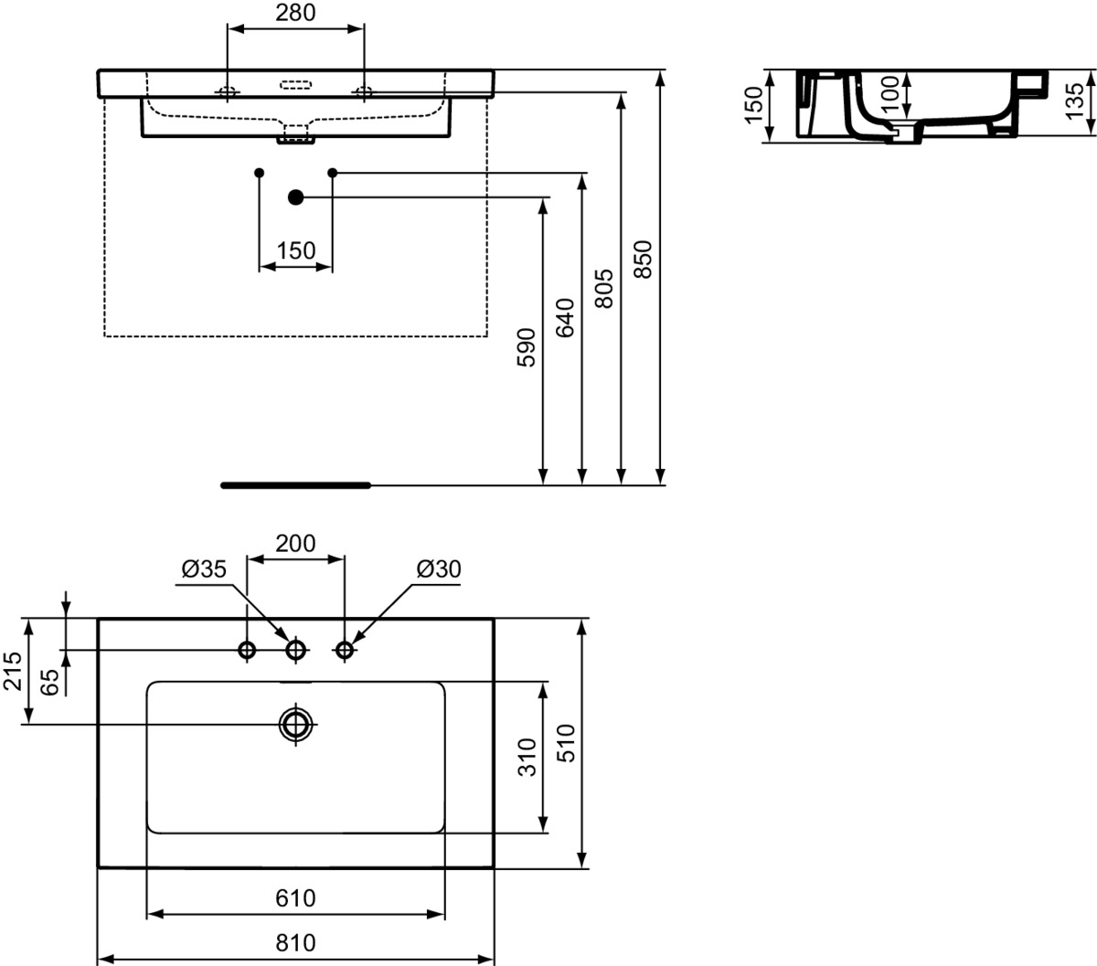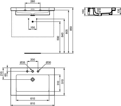 EXTRA VANITY Раковина 81 см, с тремя отверстиями под смеситель, с отверстием перелива
