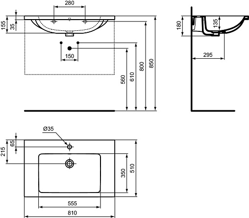 Ideal Standard i.life B Vanity раковина 81x51 см для монтажа с мебелью или соло с дизайн-сифоном, с отверстием под смеситель, с отверстием перелива. Без крепежа, рекомендуемый крепеж WW965340