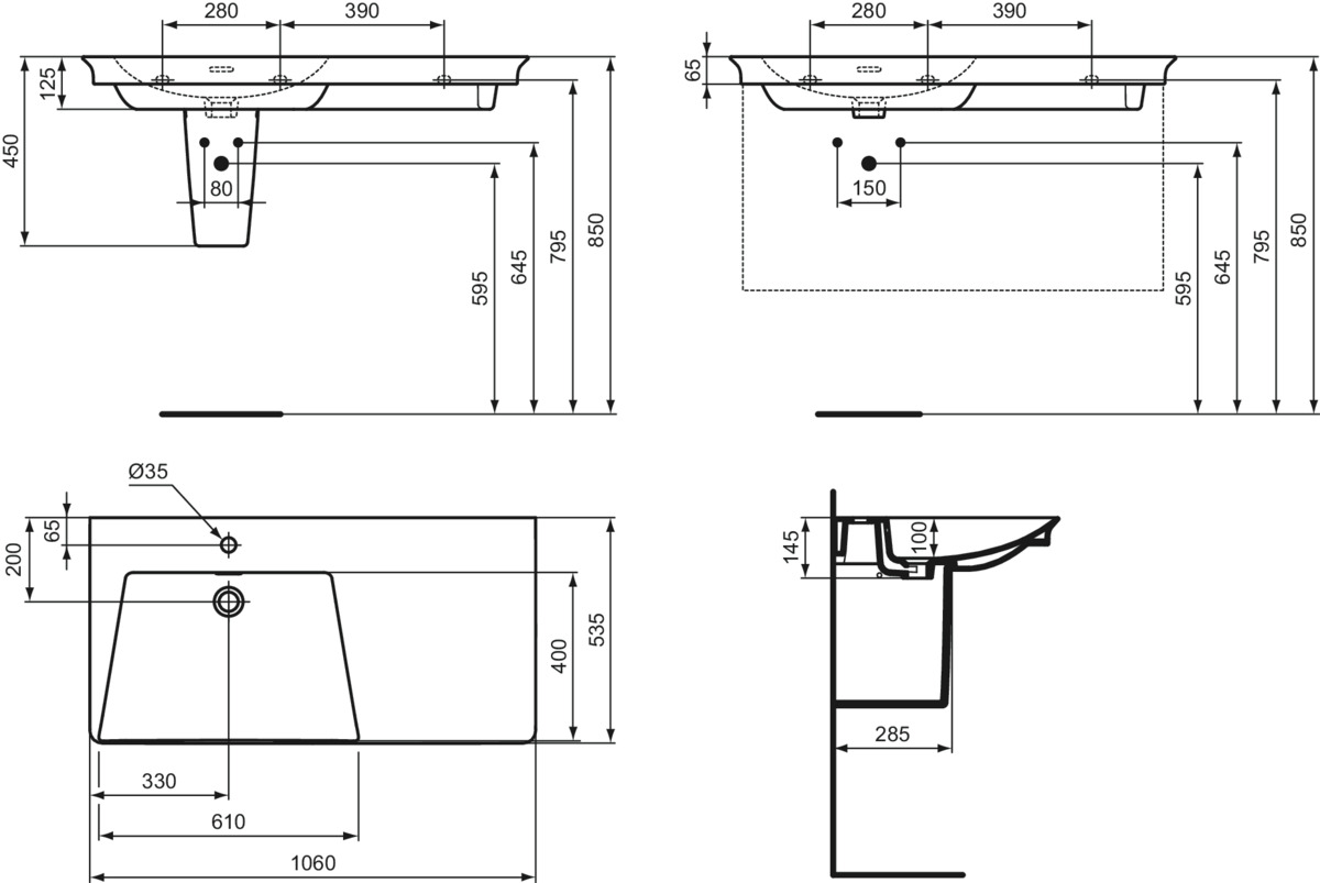 La Dolce Vita Раковина 106 см асимметричная, левая версия, с отверстием под смеситель, с отверстием перелива