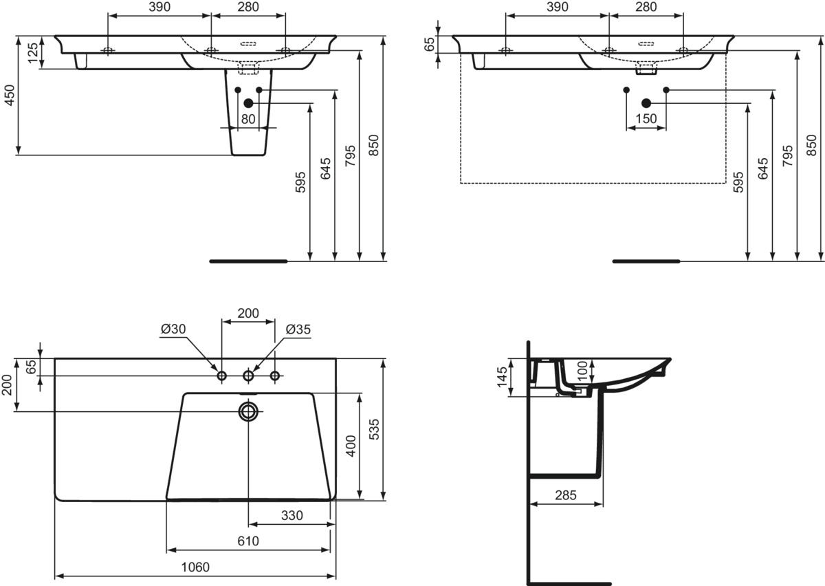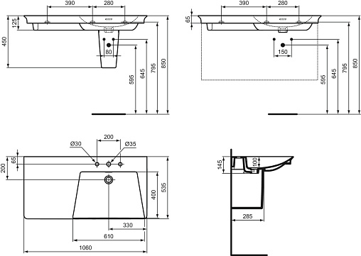 Подвесная раковина La Dolce Vita 106х53,5х14,5 см, правая, с 3-мя отверстиями под смеситель, санфарфор, с отв. под смеситель
