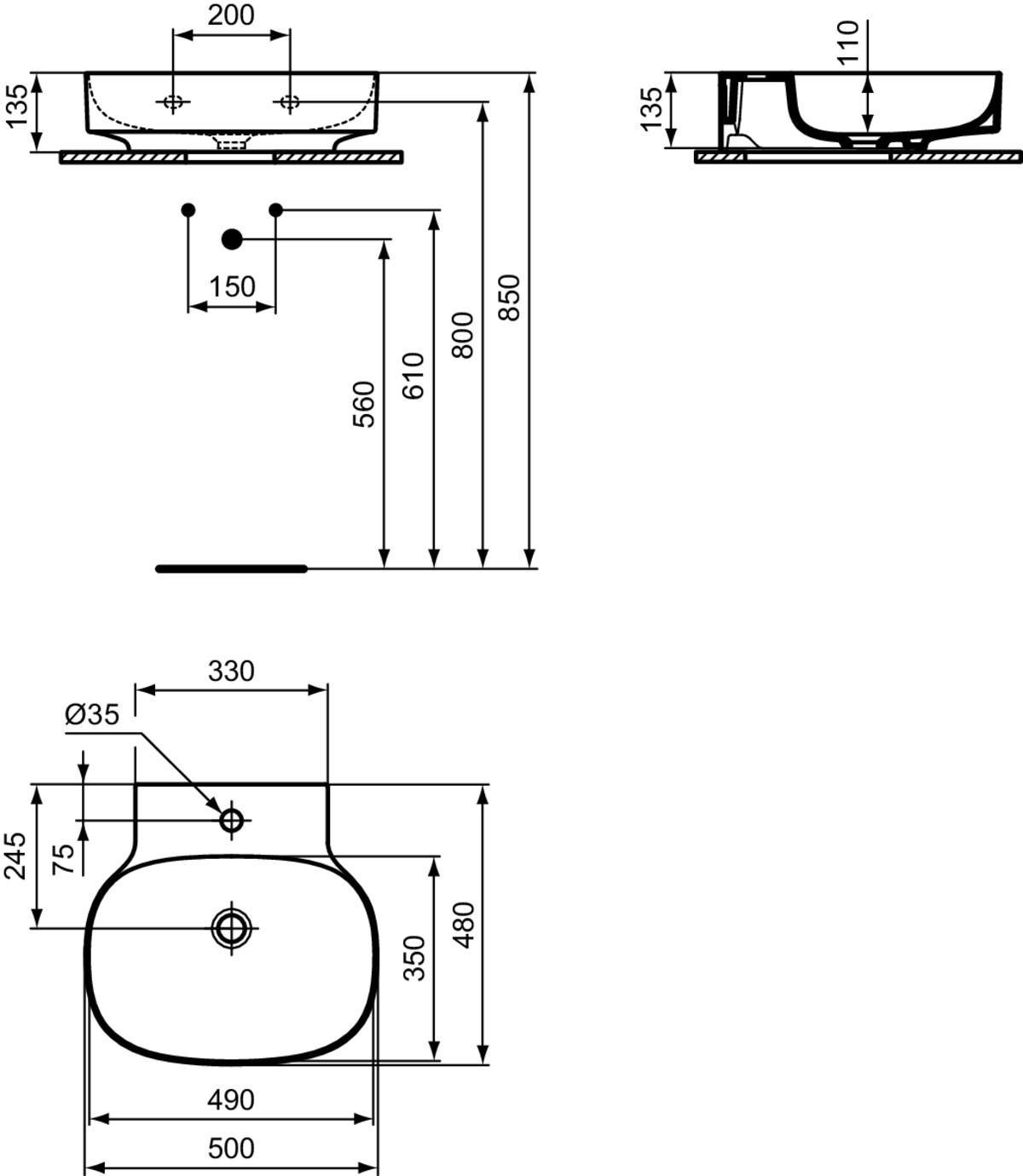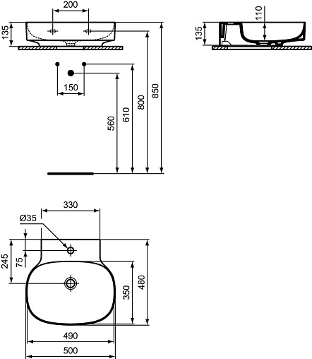 LINDA-X Раковина 50 см с отверстием под смеситель, без отверстия перелива. Технология Diamatec®. Для монтажа со скрытым переливом IdealFlow N8326AA или сливом Free flow E2114xx (заказываются дополнительно). Шлифованный низ, для настенного монтажа с мебелью или столешницей. С монтажным шаблоном. Без крепежа (рекомендованный крепеж - WW965340)
