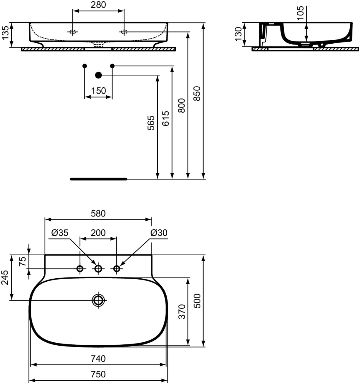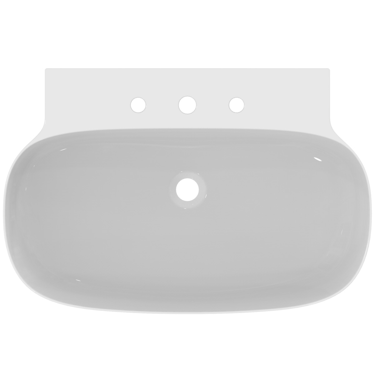 LINDA-X Раковина 75 см с тремя отверстиями под смеситель, без отверстия перелива. Технология Diamatec®. Для монтажа со скрытым переливом IdealFlow N8326AA или сливом Free flow E2114xx (заказываются дополнительно). Шлифованный низ, для настенного монтажа с мебелью или столешницей. С монтажным шаблоном. Без крепежа (рекомендованный крепеж - WW965340)