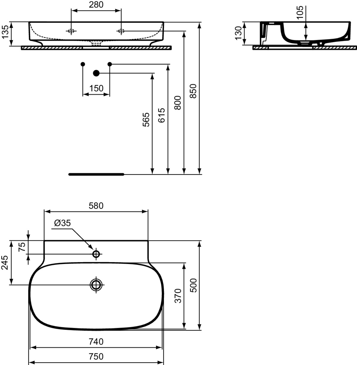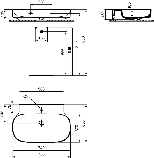LINDA-X Раковина 75 см с отверстием под смеситель, без отверстия перелива. Технология Diamatec®. Для монтажа со скрытым переливом IdealFlow N8326AA или сливом Free flow E2114xx (заказываются дополнительно). Шлифованный низ, для настенного монтажа с мебелью или столешницей. С монтажным шаблоном. Без крепежа (рекомендованный крепеж - WW965340)