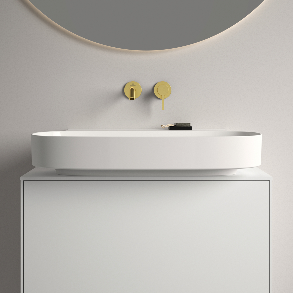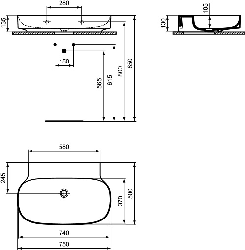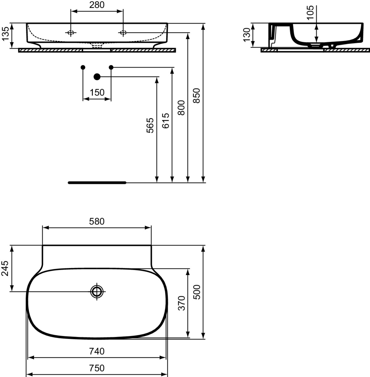 LINDA-X Раковина 75 см без отверстий под смеситель, без отверстия перелива. Технология Diamatec®. Для монтажа со скрытым переливом IdealFlow N8326AA или сливом Free flow E2114xx (заказываются дополнительно). Шлифованный низ, для настенного монтажа с мебелью или столешницей. С монтажным шаблоном. Без крепежа (рекомендованный крепеж - WW965340)