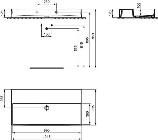 SOLOS Раковина 100х50 см, технология Diamatec®, без отверстий под смеситель, без отверстия перелива, нижняя поверхность отшлифована.