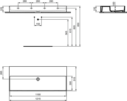 SOLOS Раковина 120х50 см, технология Diamatec®, без отверстий под смеситель, без отверстия перелива, нижняя поверхность отшлифована.