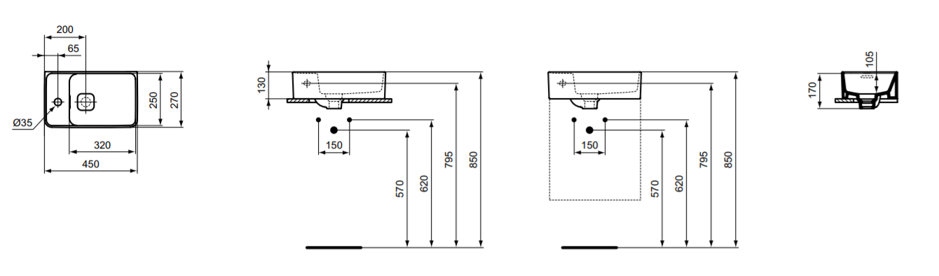 Strada II 45х27х13см, подвесная раковина, санфаянс, отверстие под смеситель слева, арт. T299501, Ideal Standard