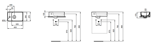 Асимметричный умывальник 45х27 см (платформа и отверстие под смеситель слева)