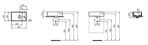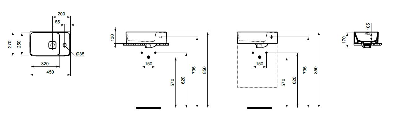 Асимметричный умывальник 45х27 см (платформа и отверстие под смеситель справа), для монтажа с дизайн-сифоном, с отверстием перелива (щелевого типа), с керамической