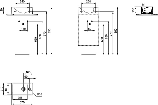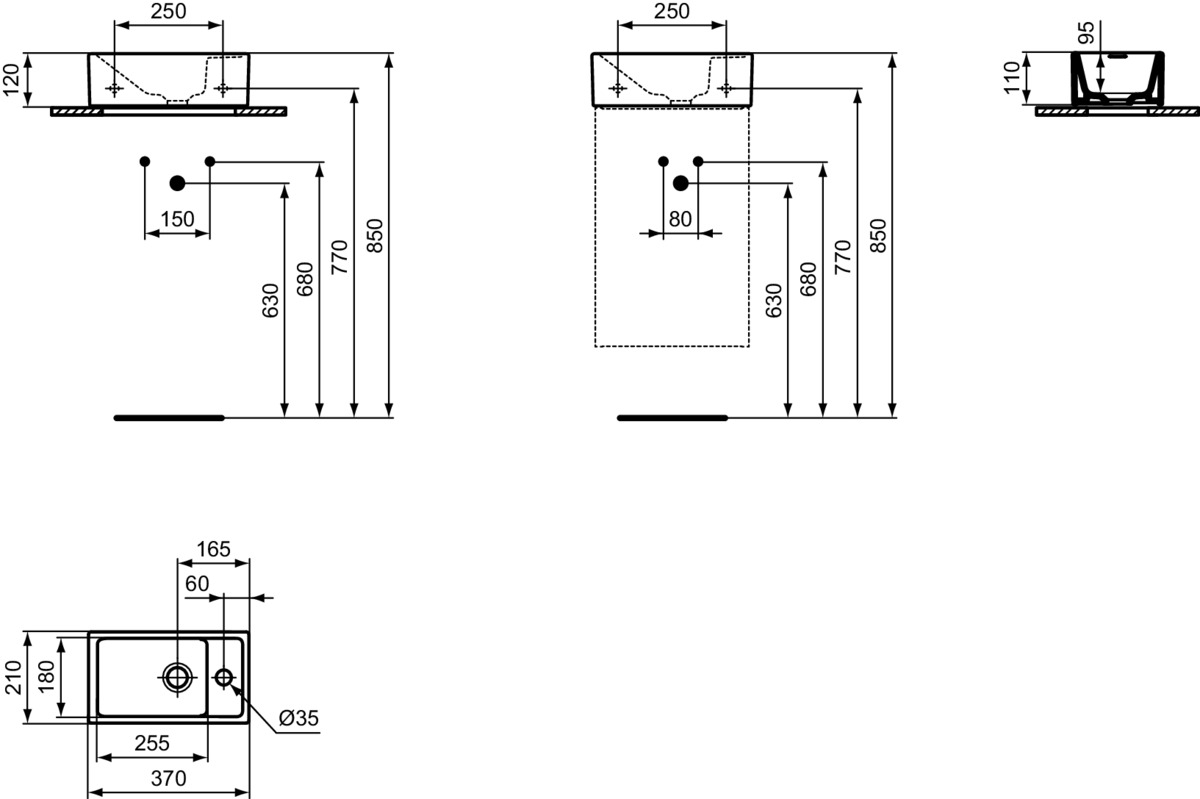 TEMPO раковина 37х21 см, отверстие под смеситель справа. Для монтажа соло на стене. Без крепежа, рекомендуемый крепеж - K714467