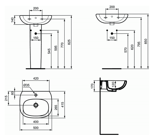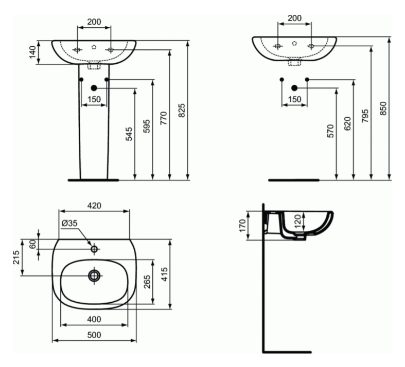 Умывальник 50x41,5 см для монтажа с сифоном, колонной или полуколонной, с отверстием под смеситель, с отверстием перелива, без крепежа