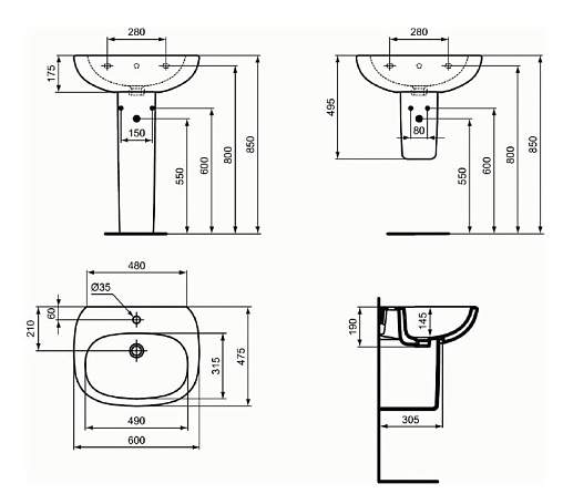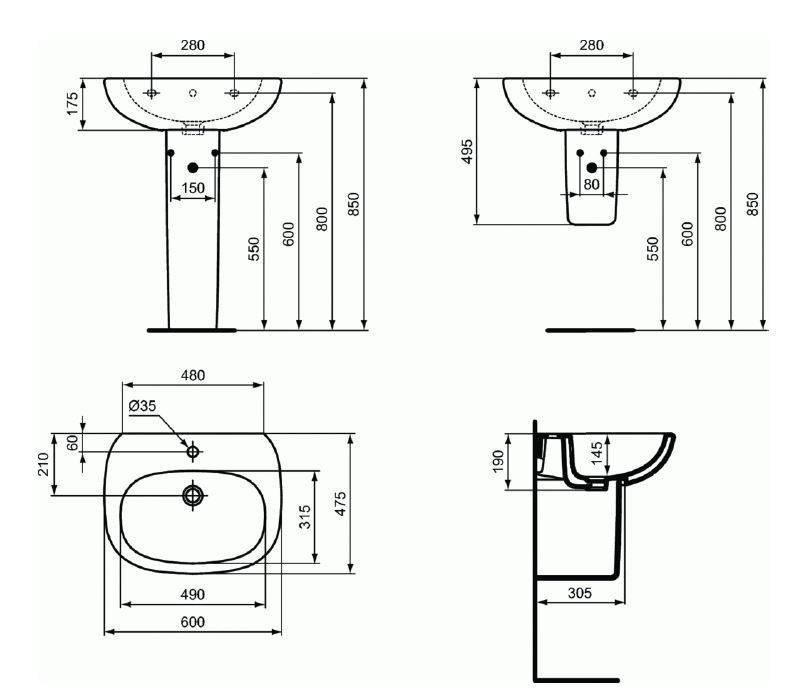 Умывальник 60 см для монтажа с сифоном, колонной или полуколонной, с отверстием под смеситель, с отверстием перелива