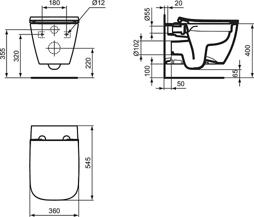 I.life B 36х54,5см, подвесной унитаз, безободковый, с сиденьем, микролифт, быстросъемное, серый цвет, арт. T533058, Ideal Standard