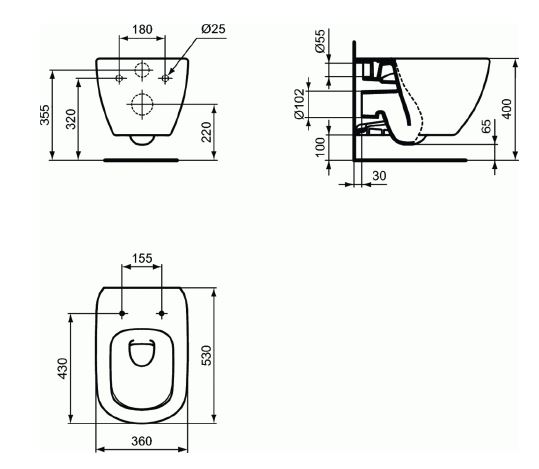 Подвесной унитаз, глубокий смыв, сидение и крышка заказывается дополнительно, с крепежом (для полностью скрытого монтажа)