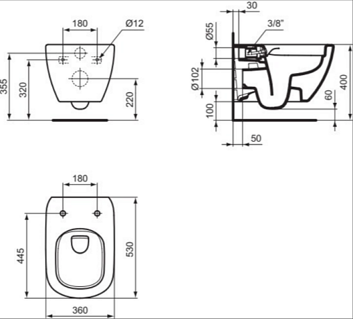 Глубокий смыв, сидение и крышка заказывается дополнительно, с крепежом для полностью скрытого монтажа