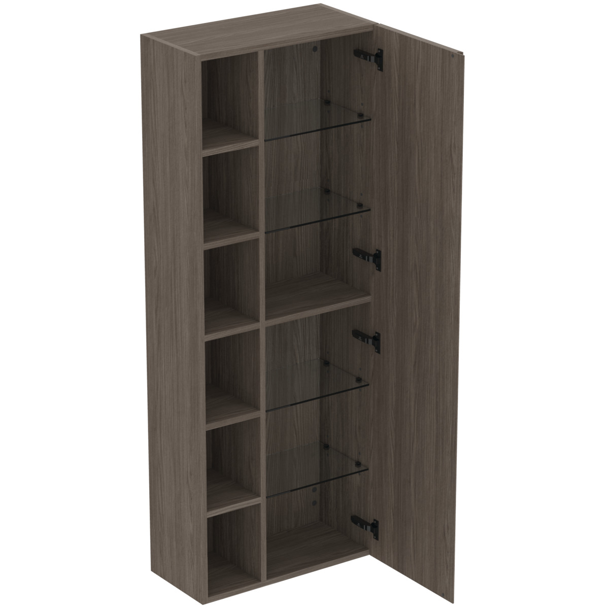 FINESSE Пенал для подвесного монтажа, реверсивный, модуль с 1-й дверцей (с 4-мя регулируемыми стеклянными и 1-й деревянной полкой) и открытый модуль без дверцы (с 5-ю деревянными полками), система плавного закрытия. Конструкция без ручек - паз вдоль дверцы для легкого открывания. C крепежом.