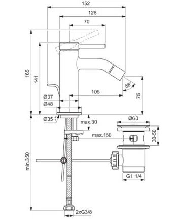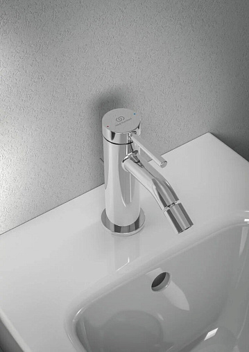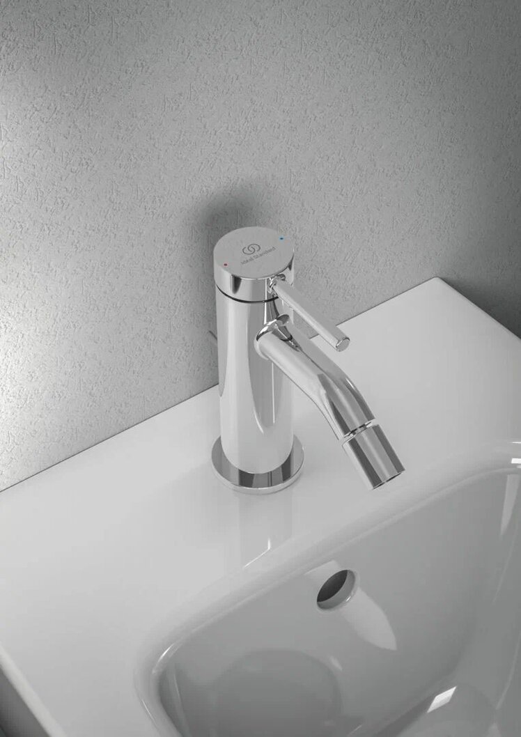 CERALINE NUOVO Однорукоятковый смеситель для биде, керамический картридж FirmaFlow 28 мм с функцией HWTC (ограничение максимальной температуры горячей воды), гибкая подводка G3/8", система монтажа EASY-FIX (облегченный монтаж), аэратор на шаровом шарнире (поворотный) с ограничением потока на 3,8 л/мин., металлическая рукоятка с индикаторами горячей / холодной воды, металлический донный клапан. Упаковка без пластика.