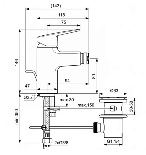 CERAPLAN Смеситель для биде с металлическим донным клапаном, система монтажа EASY-FIX (облегченный монтаж),