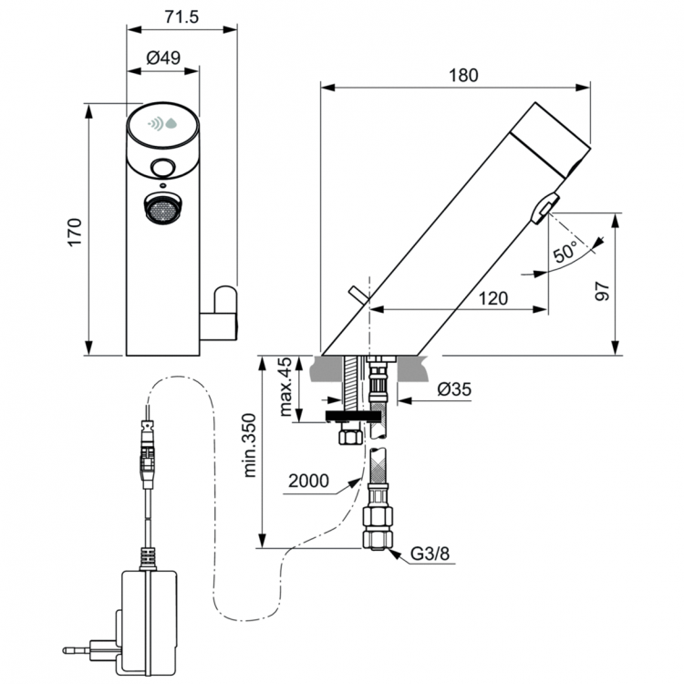 Сенсорный смеситель на раковину Sensorflow New питание от сети, упр. t° на корпусе