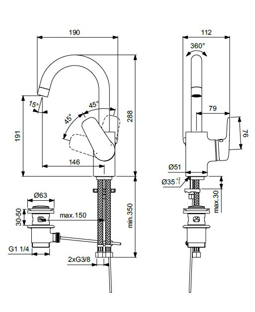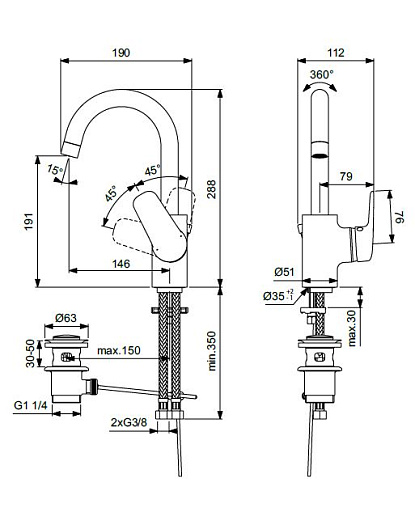 Трубчатый поворотный излив, длина излива 146 мм, угол поворота 360° (без ограничений)