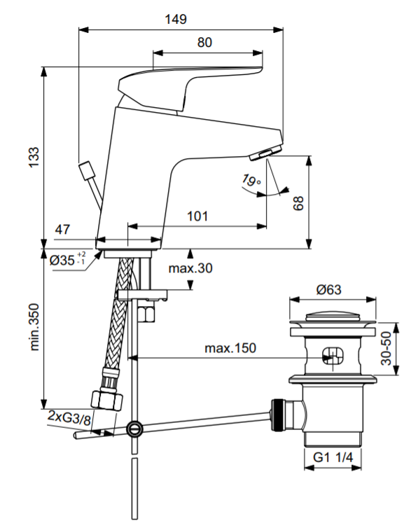 Смеситель для умывальника Ceraflex система монтажа easy-fix, 13,3 см, неповоротный излив, с донным клапаном
