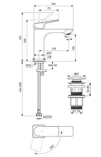 CeraLife C, смеситель для умывальника, неповоротный излив, с донным клапаном, холодный старт, арт. BE047AA, Ideal Standard