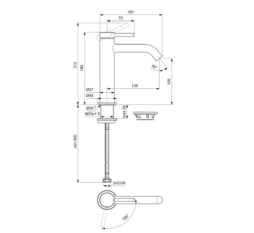 Ceraline nuovo, смеситель для умывальника, неповоротный излив, чёрный цвет, без донного клапана, холодный старт, арт. BD760XG, Ideal Standard