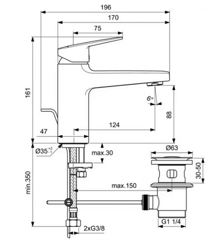 Смеситель для умывальника Ceraplan система монтажа easy-fix, неповоротный излив, с донным клапаном