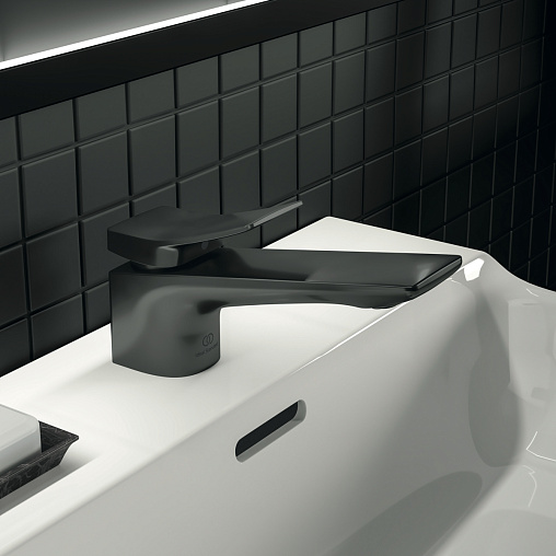 CONCA Однорукоятковый смеситель для раковины, керамический картридж 28 мм, с функцией HWTC (ограничение максимальной температуры горячей воды), без функции CLICK, логотип Ideal Standard на корпусе, металлическая рукоятка без индикаторов горячей/холодной воды, аэратор Coin slot M24x1 с ограничением потока 5 л/мин, система монтажа EASY-FIX (облегченный монтаж), гибкая подводка G3/8" PEX. Цветное покрытие - технология PVD