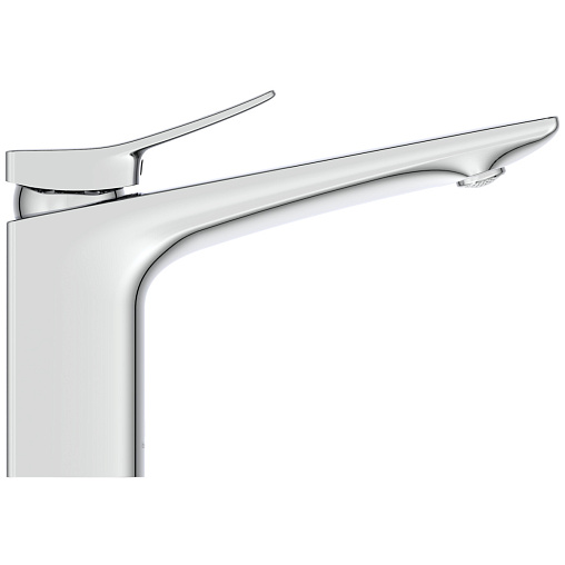 CONCA Grande Однорукоятковый смеситель для раковины без донного клапана, керамический картридж 28 мм, с функцией HWTC (ограничение максимальной температуры горячей воды), без функции CLICK, логотип Ideal Standard на корпусе, металлическая рукоятка без индикаторов горячей/холодной воды, аэратор Coin slot M24x1 с ограничением потока 5 л/мин, система монтажа EASY-FIX (облегченный монтаж), гибкая подводка G3/8" PEX