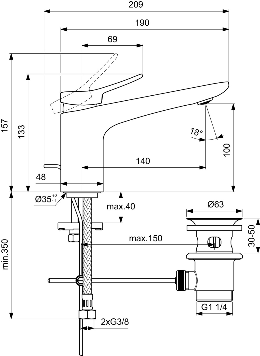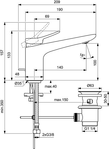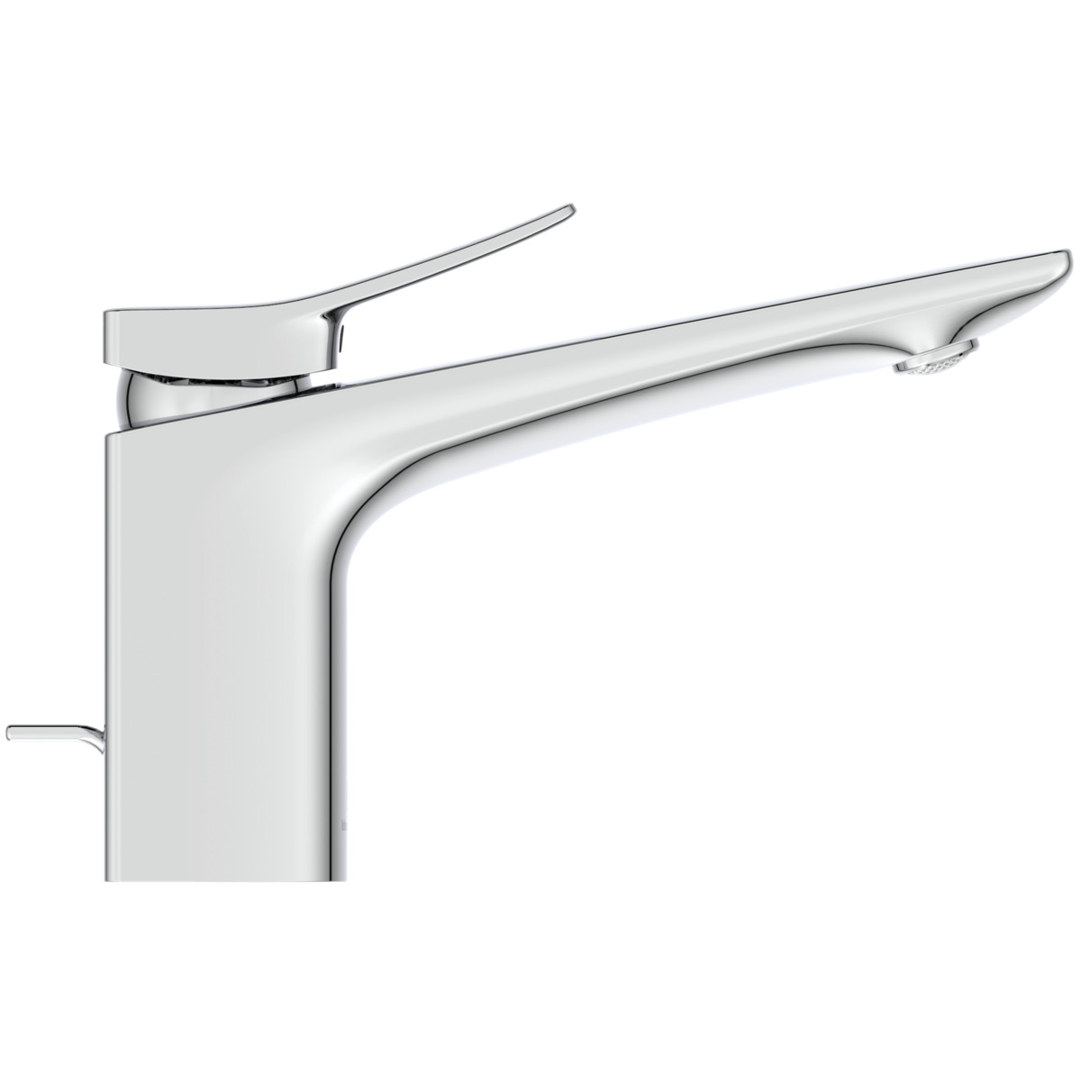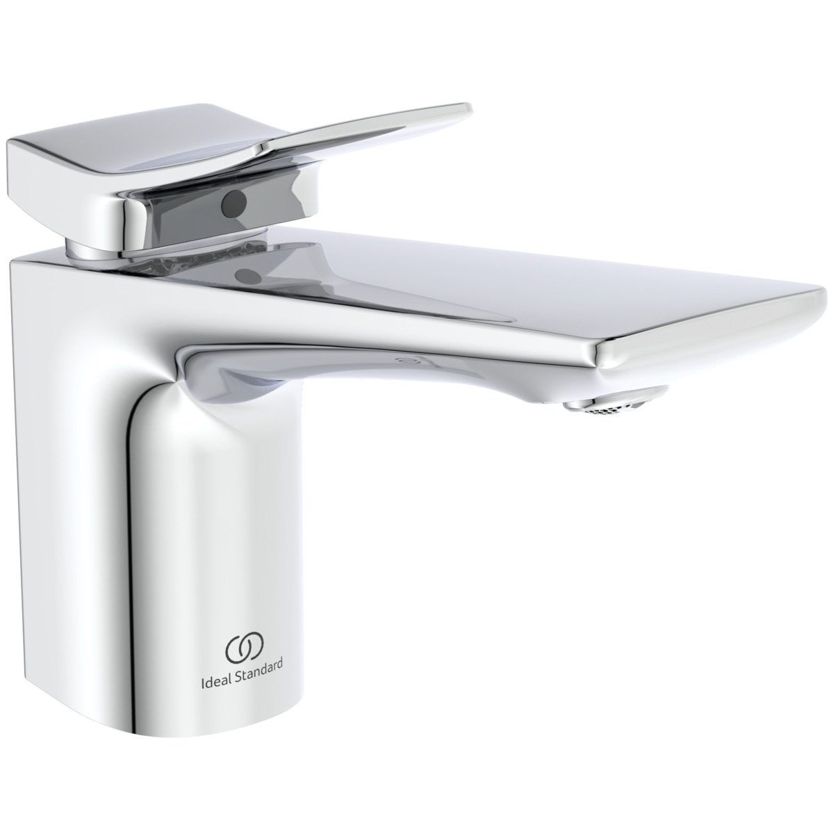 CONCA Grande Однорукоятковый смеситель для раковины с металлическим донным клапаном, керамический картридж 28 мм, с функцией HWTC (ограничение максимальной температуры горячей воды), без функции CLICK, логотип Ideal Standard на корпусе, металлическая рукоятка без индикаторов горячей/холодной воды, аэратор Coin slot M24x1 с ограничением потока 5 л/мин, система монтажа EASY-FIX (облегченный монтаж), гибкая подводка G3/8" PEX
