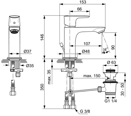Connect Air, смеситель для умывальника, неповоротный излив, с донным клапаном, картридж 25 мм, арт. A7007AA, Ideal Standard