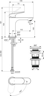 Ophira, смеситель для умывальника, неповоротный излив, с донным клапаном, холодный старт, арт. D2664AA, Ideal Standard
