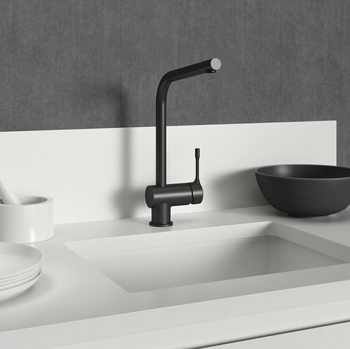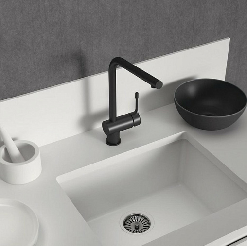 Высокий смеситель на столешницу Ceraline 32,2 см, матовый, поворотный излив, чёрный цвет, без донного клапана