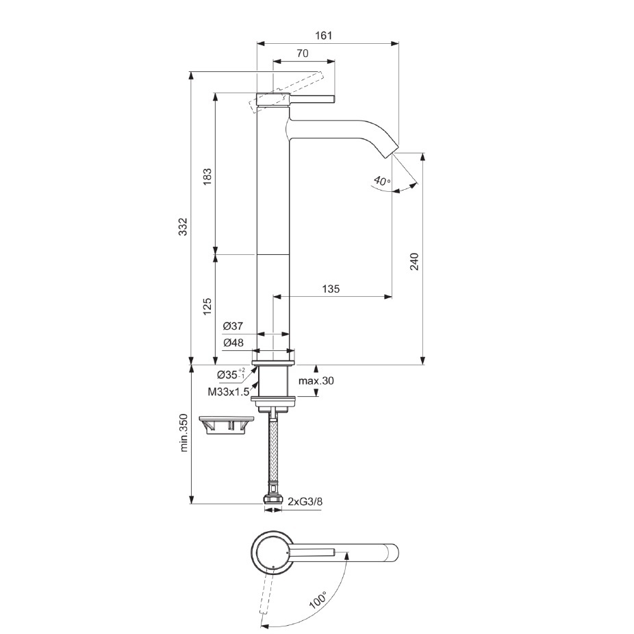 Ceraline nuovo 30см, высокий смеситель на столешницу, неповоротный излив, чёрный цвет, без донного клапана, холодный старт, арт. BD762XG, Ideal Standa