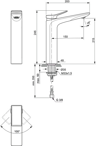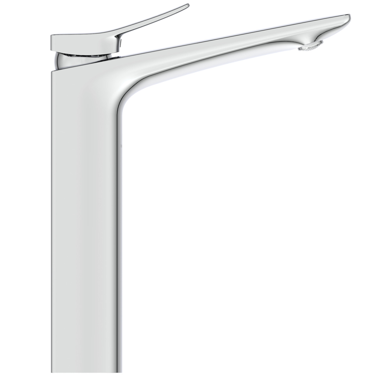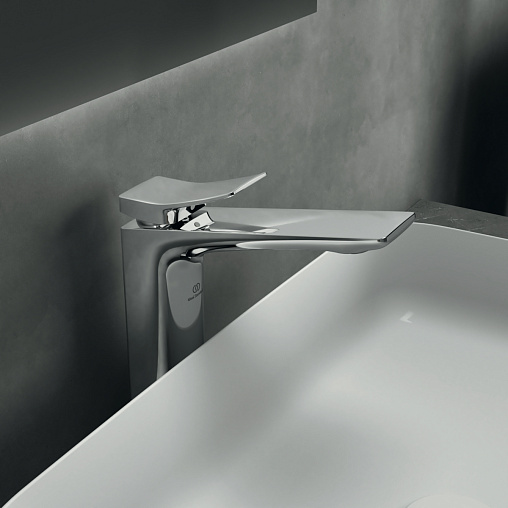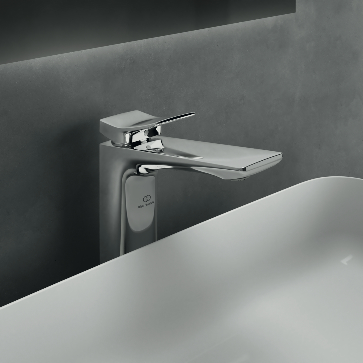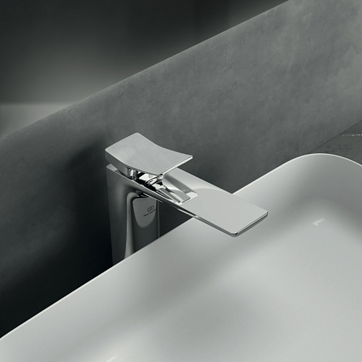 CONCA Однорукоятковый смеситель для раковины Vessel, керамический картридж 28 мм, с функцией HWTC (ограничение максимальной температуры горячей воды), без функции CLICK, логотип Ideal Standard на корпусе, металлическая рукоятка без индикаторов горячей/холодной воды, аэратор Coin slot M24x1 с ограничением потока 5 л/мин., система монтажа EASY-FIX (облегченный монтаж), гибкая подводка G3/8" PEX
