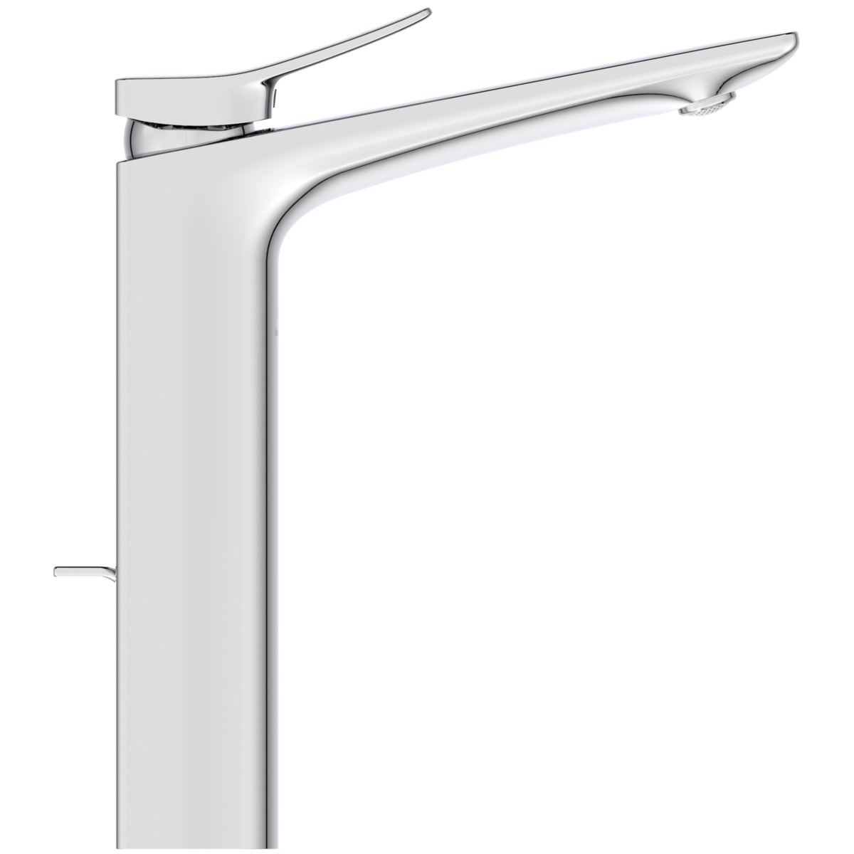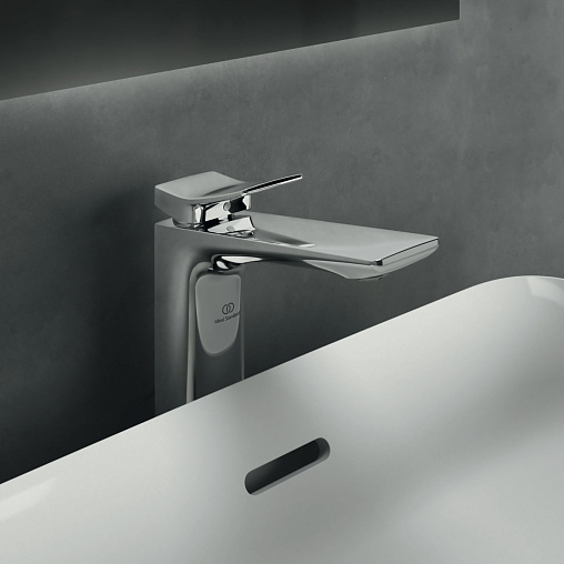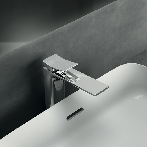 CONCA Однорукоятковый смеситель для раковины Vessel с донным клапаном, керамический картридж 28 мм, с функцией HWTC (ограничение максимальной температуры горячей воды), без функции CLICK, логотип Ideal Standard на корпусе, металлическая рукоятка без индикаторов горячей/холодной воды, аэратор Coin slot M24x1 с ограничением потока 5 л/мин., система монтажа EASY-FIX (облегченный монтаж), гибкая подводка G3/8" PEX, металлический донный клапан