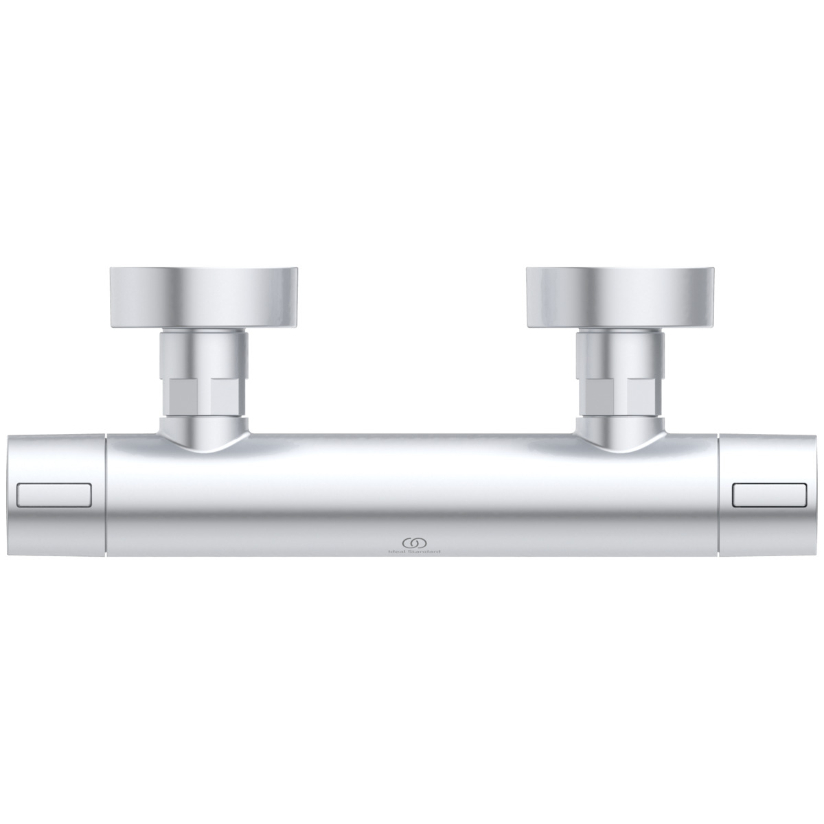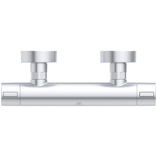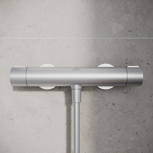 ALU+ Настенный термостатический смеситель для душа, монтаж на стандартных эксцентриках, термостатический картридж IS, затворы на керамических дисках G1/2 90˚, технология "Cool body" ("Холодный корпус"), пластиковые рукоятки с ограничителями температуры (40ºC) и потока воды (50%), встроенные обратные клапаны