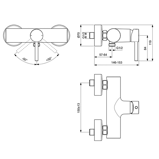 Настенный смеситель без излива Ceraline, без лейки, матовый черный, хром, арт. BC200U4, Ideal Standard